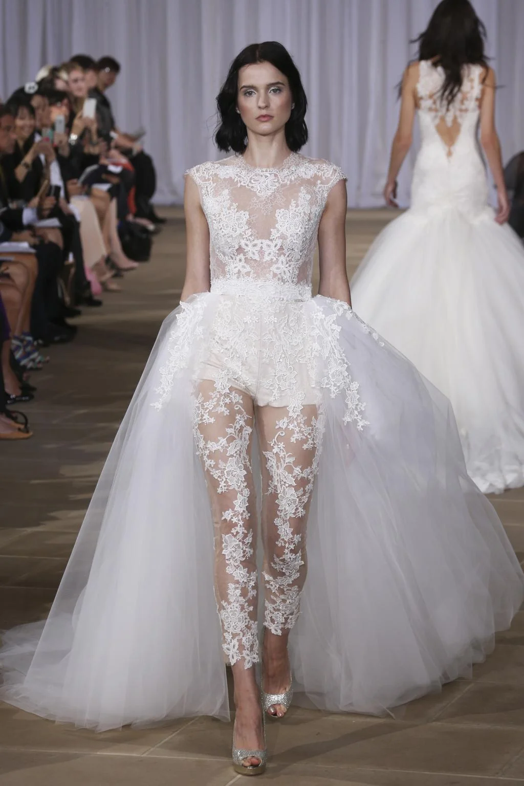 This collection played with fabric in new and interesting ways, swaths of silver flowed into nudes and nary a full white dress was seen. Notice the cloud-like, gossamer quality and the voluminous but ultra-light bolero in photo four.
