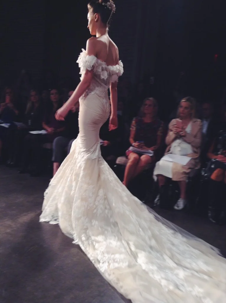 Now that we're back from Bridal Market (aka #nybfw) we can finally share all these amazing photos that we snapped real time! Catherine and Keidy were in New York for the week soaking up all the chicness fresh off the runway. At Inbal Dror's Fall/Winter 2016 show, we saw a whole lot of classic Inbal; sexy, show-stopping numbers for a bride looking to make a statement. The slits were high. The neckline was low. And the silhouettes showed of a sexy shape. We swooned. We snapped pictures of as many looks as we could, but who could blame us for getting a bit distracted as these looks walked down the runway?