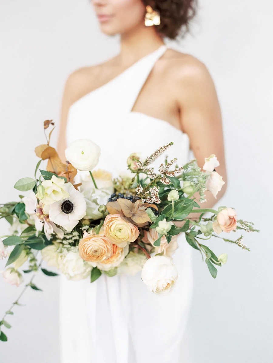 We love the approach to these wild and modern florals paired with the clean lines of the Romona Keveza wedding dress. Pair that with the stunning architecture of The Wharf Miami, a new wedding venue on the Miami River with a slightly industrial feel, and we’re smitten!