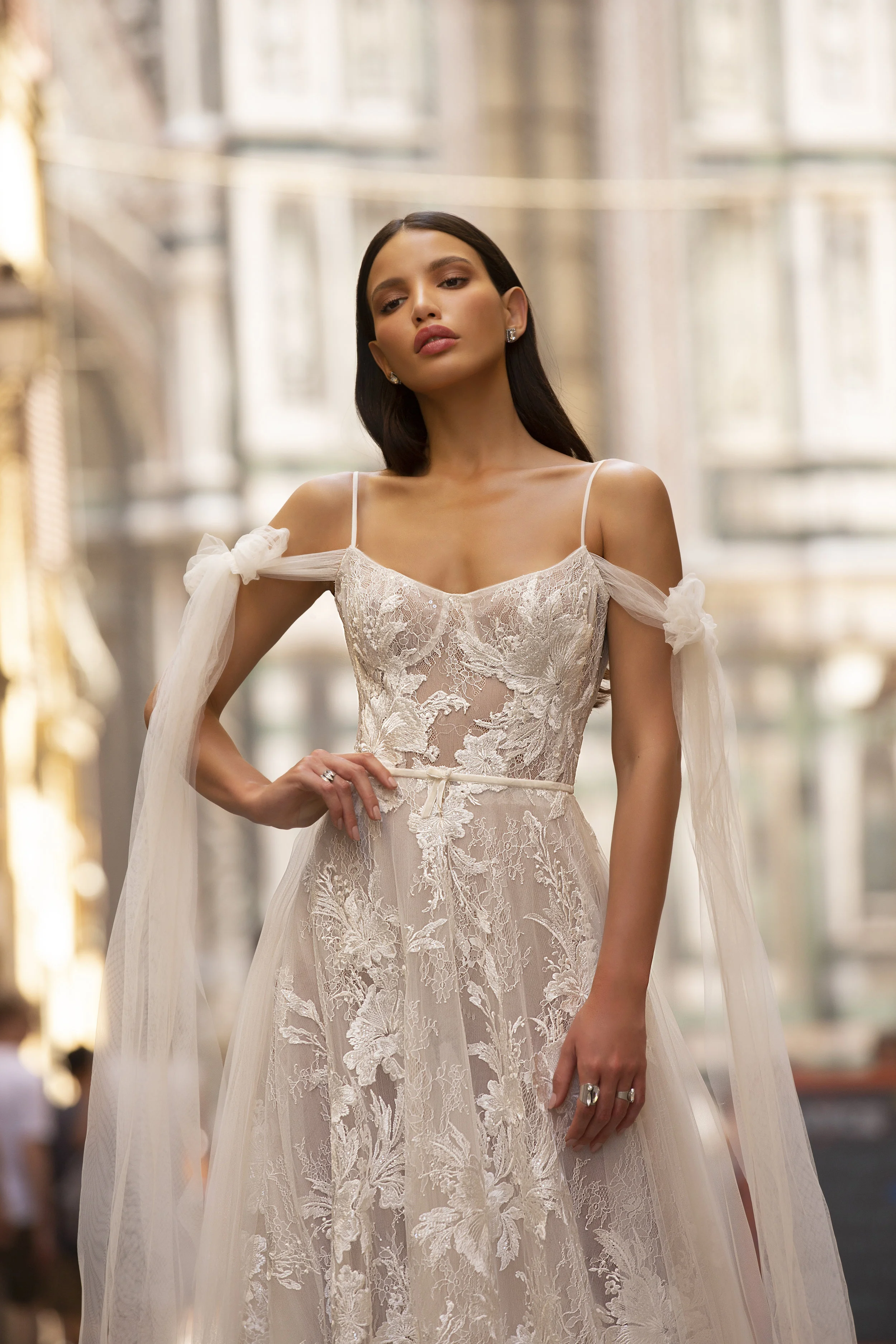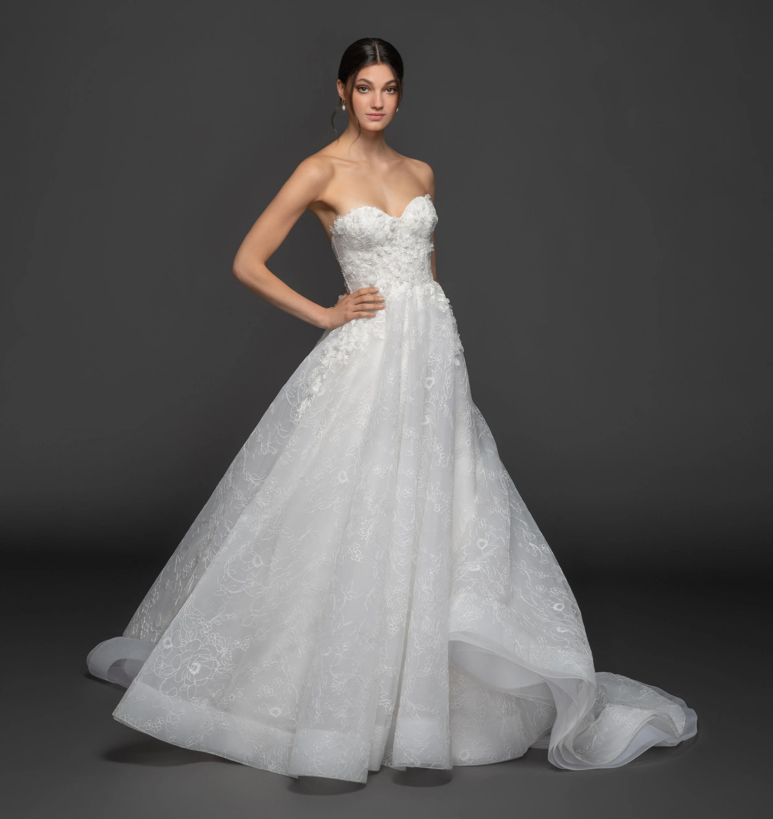 The laces chosen by Monique Lhuillier in this special collection of wedding dresses are particular standouts. There are throwbacks to some of the brand’s all time favorite looks as well as experiments with new laces. be sure to ask us about the many different reveal looks available in this collection. We saw a plethora of boleros. shawls and chic two-in-one looks that we know you’ll be swooning over as you picture yourself walking down the aisle in these chic confections.