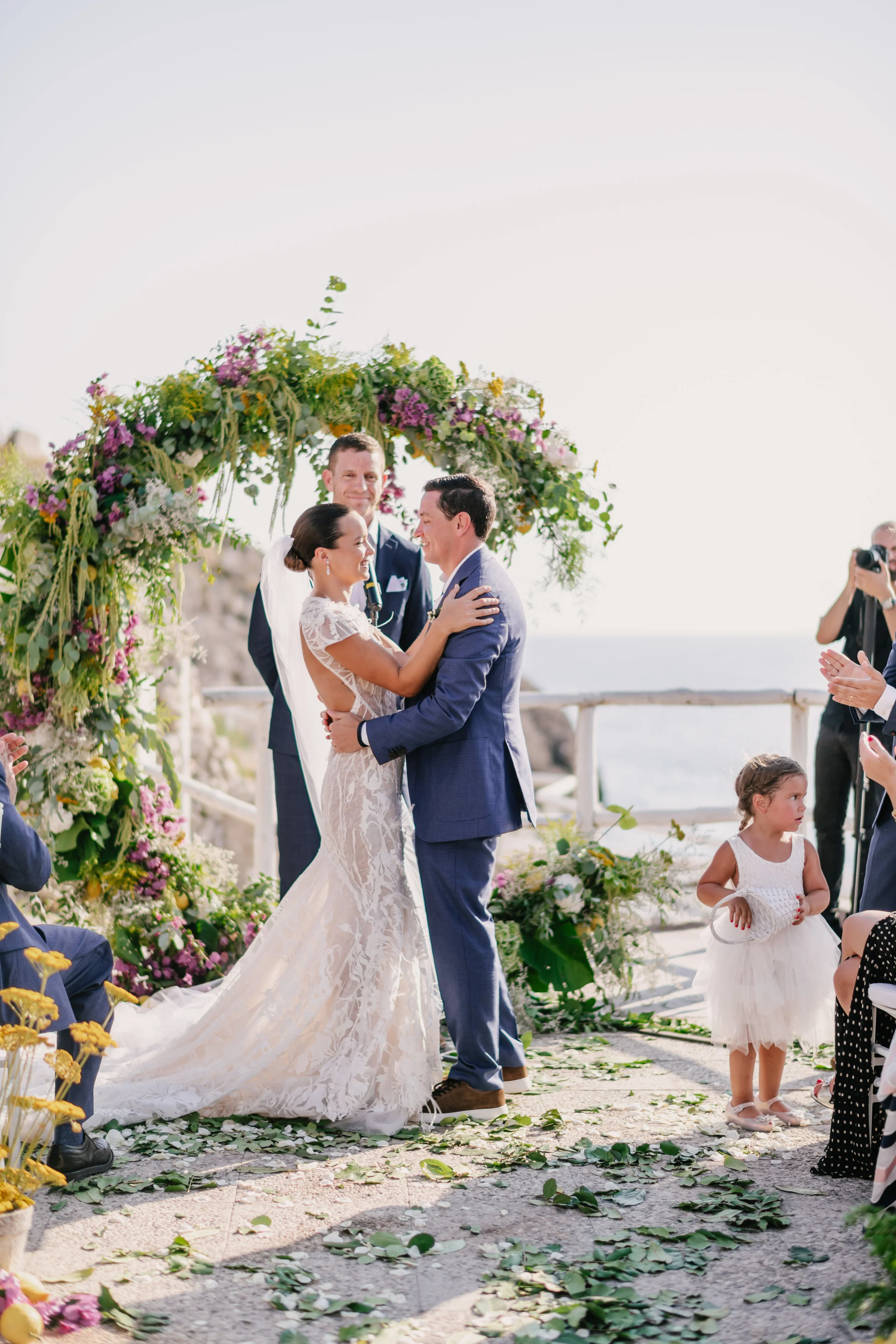 Mike and I have always loved traveling and after a long conversation venting to one of my best friends about venue options, one night realized that a destination wedding was such a better fit for us. Being that Mike and I are both from Italian families and it’s one of our favorite places, we initially decided on Portofino as we had vacationed there the summer before and had such an amazing time. Federica, our planner, convinced us to look at Southern Italy after discussing the things that were important to us and really sold me on this “magical ocean location that was not your typical wedding venue.” That got me from the start and even looking at pictures of Lido Del Faro did not prepare me for how beautiful it was in person (which I didn’t see until the day I walked down the aisle)! I’ve always loved the ocean and was way more into cliffside beach club vibes than a more formal hotel-type setting.