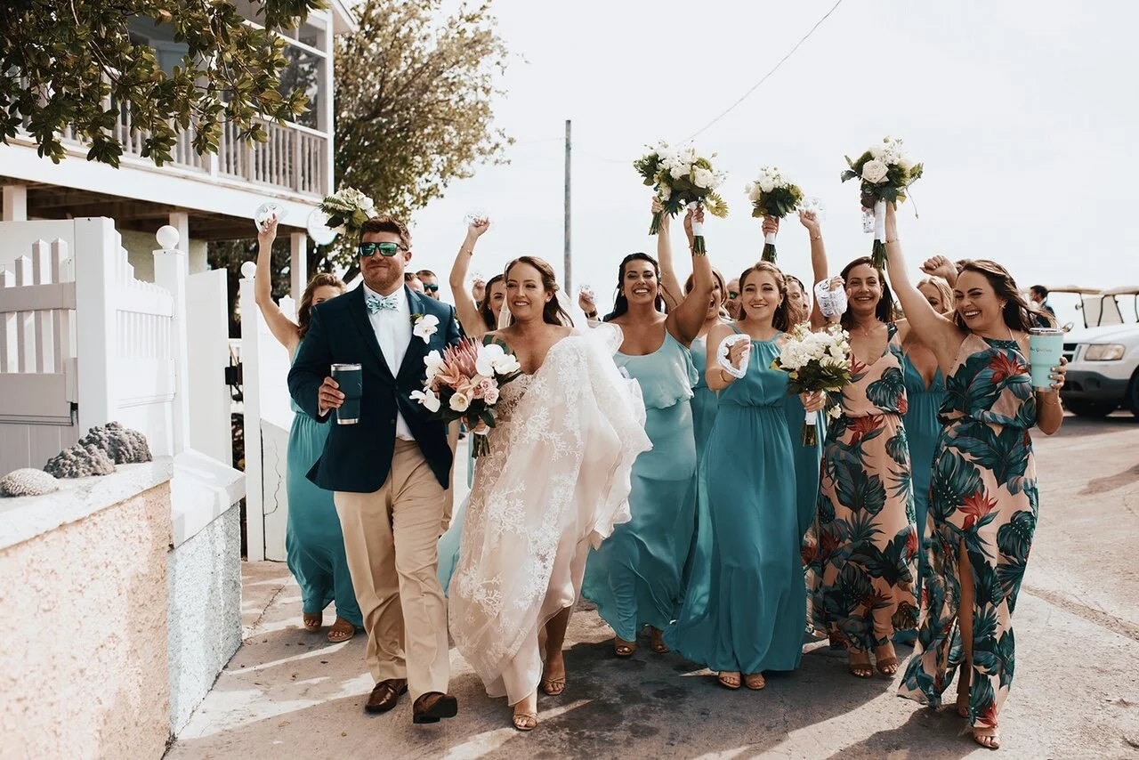 We got married on a very small island in the Abaco's and something that was really important to us was using as many local services as we could to give support to the local community there. All of our flowers came from the Bahamas, the band was a local band from an island nearby, our Priest was from the Bahamas etc. We wanted everyone to really utilize their time in the Bahamas since it takes a bit of travel time to get there. So my main priority was making sure there was something planned out every day so everyone could get the full Bahamas experience. It was a lot to plan a full 4 days for everyone but it was worth it! We did a BBQ with the locals on Thursday night, went to see the swimming pigs on Friday, a big welcome party Friday night, the wedding Saturday, and then we took whoever was still there to Nippers which is a bar on an island nearby on Sunday! We liked to call it adult spring break!