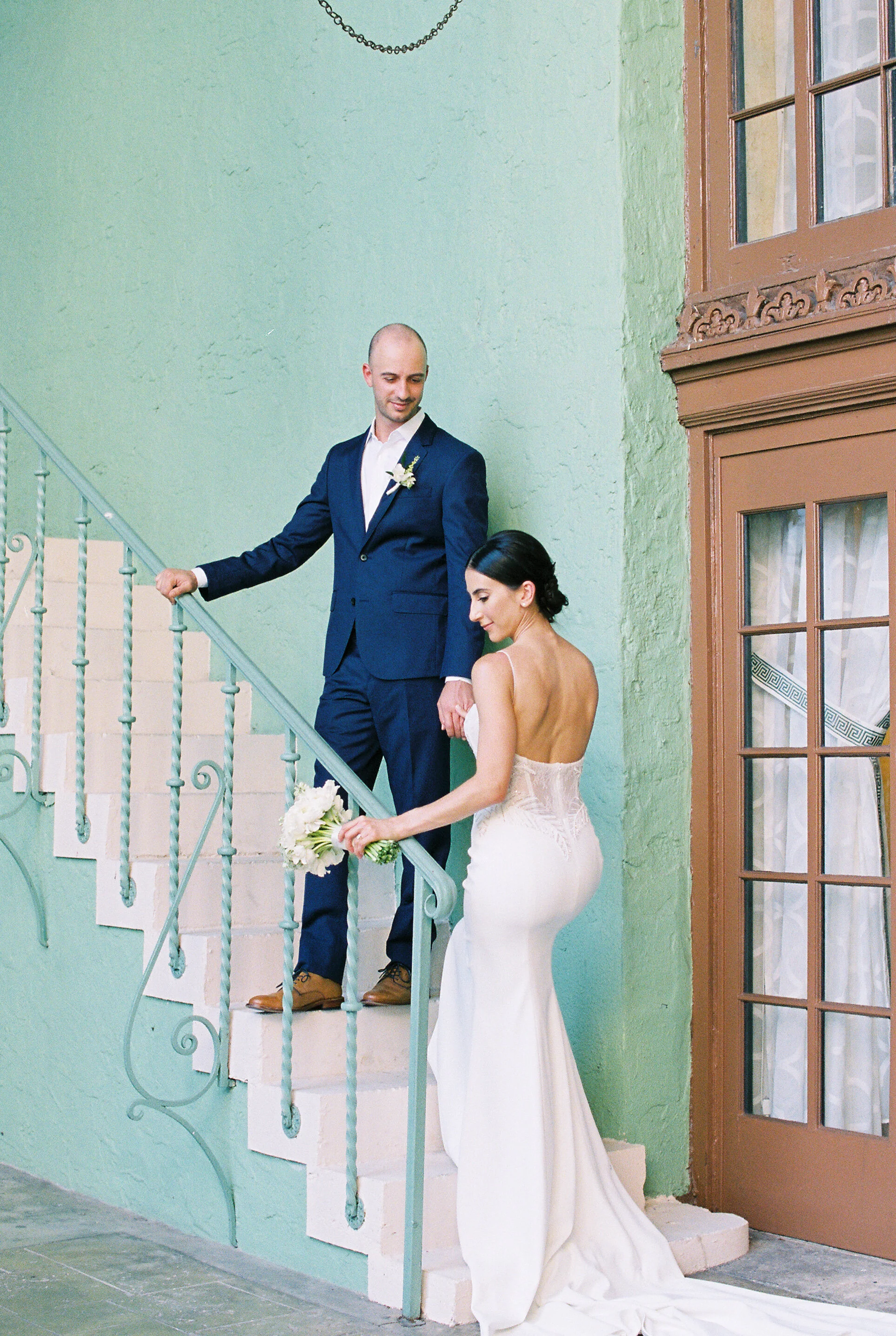 We had to style this chic gown in the surrounding neighborhood of Coral Gables, where our boutique is located because the lushness of our streets was the perfect backdrop for this verdant-nature-inspired dress. This halter neck wedding dress is a chic and modern twist on a bridal silhouette that we haven’t seen much of in the past few years, if you’re a fashion-forward bride, this is the dress for your to make a statement on your wedding day. Brides looking for a more subtle way to wear this dress can consider ordering it in white instead of the green accents.