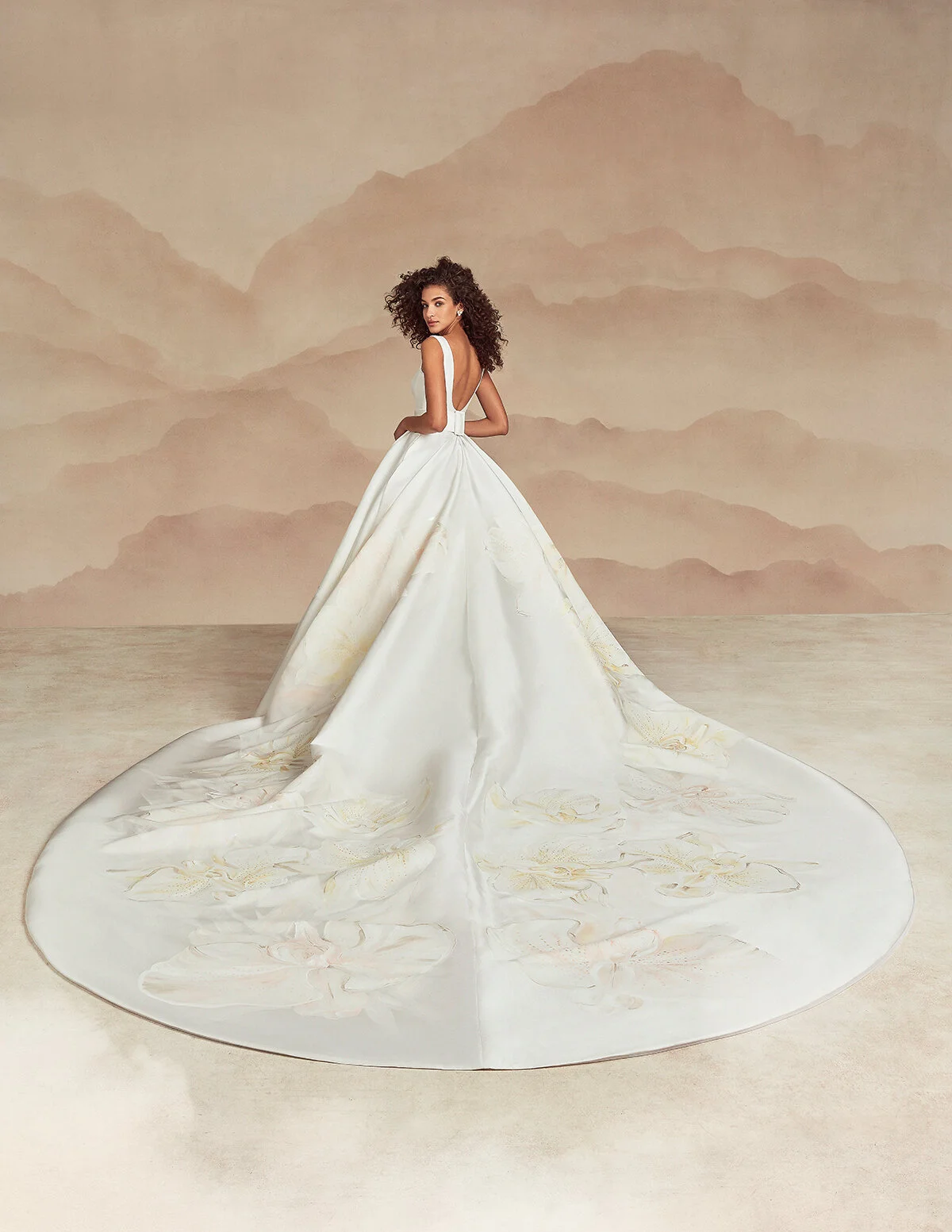 “The Monique Lhuillier Fall 2021 Bridal Collection is regal and timeless with an exuberance for embracing love and life! This season is all about epic volume, bursts of color, intricate prints and unexpected embroideries. The collection radiates joy with fuchsia, feather accents, delicate lily of the valley floral details and exaggerated trains. Romantic with a sense of classic details -- billowing sleeves, softs layers, versatile components such as seamlessly detachable boleros, jackets, and over the top veils complete each look. She's unforgettable.”