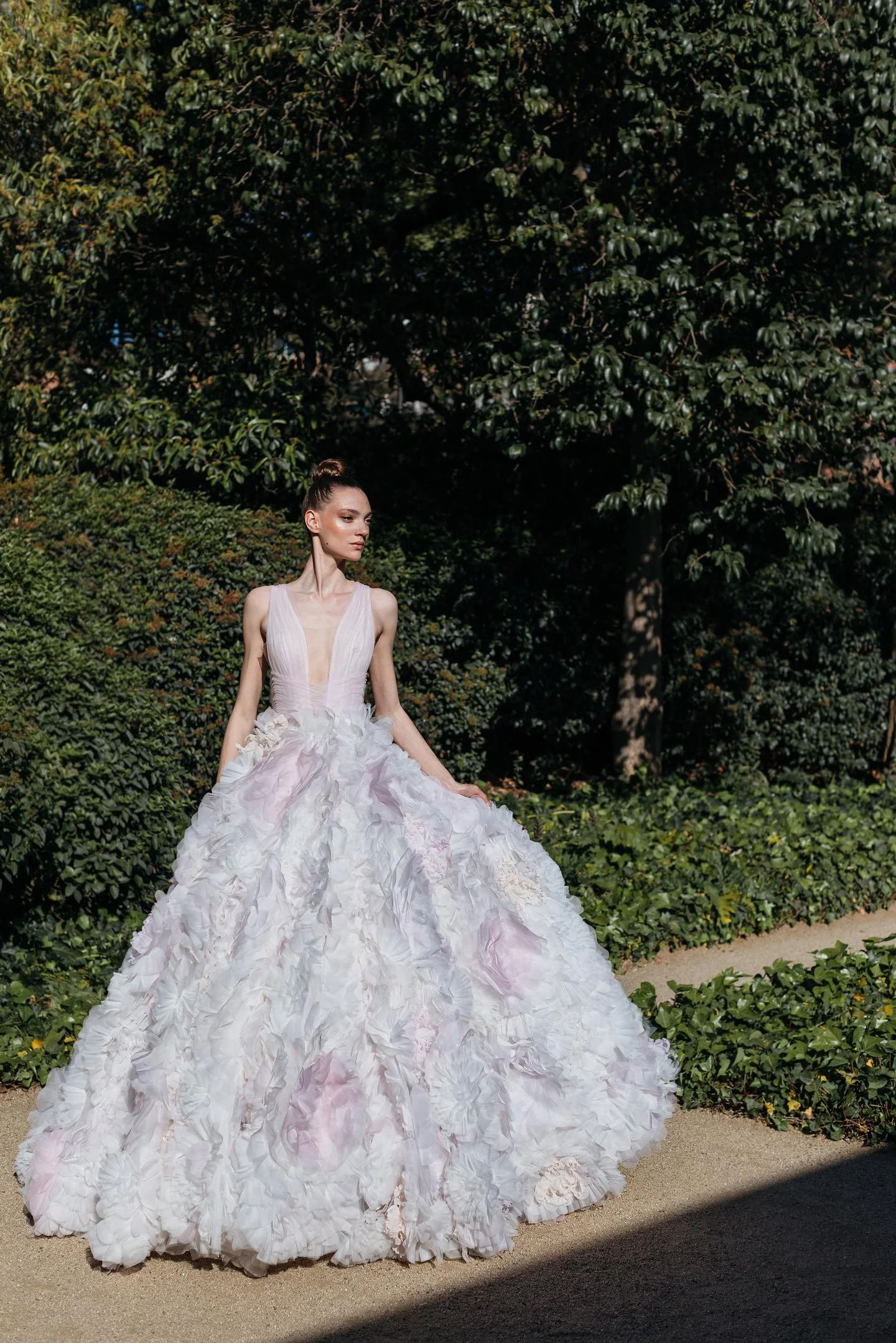 When we first say this collection at New York Bridal Fashion Week, our first impression was that there is really something for every kind of bride in this edit. If you’re looking for a ballgown, there are plenty. Looking for lace? Wait until you see these! If you are head over heels for the signature Monique Lhuillier florals, there are brand new takes on these special and different wedding dresses that are brimming with romance.