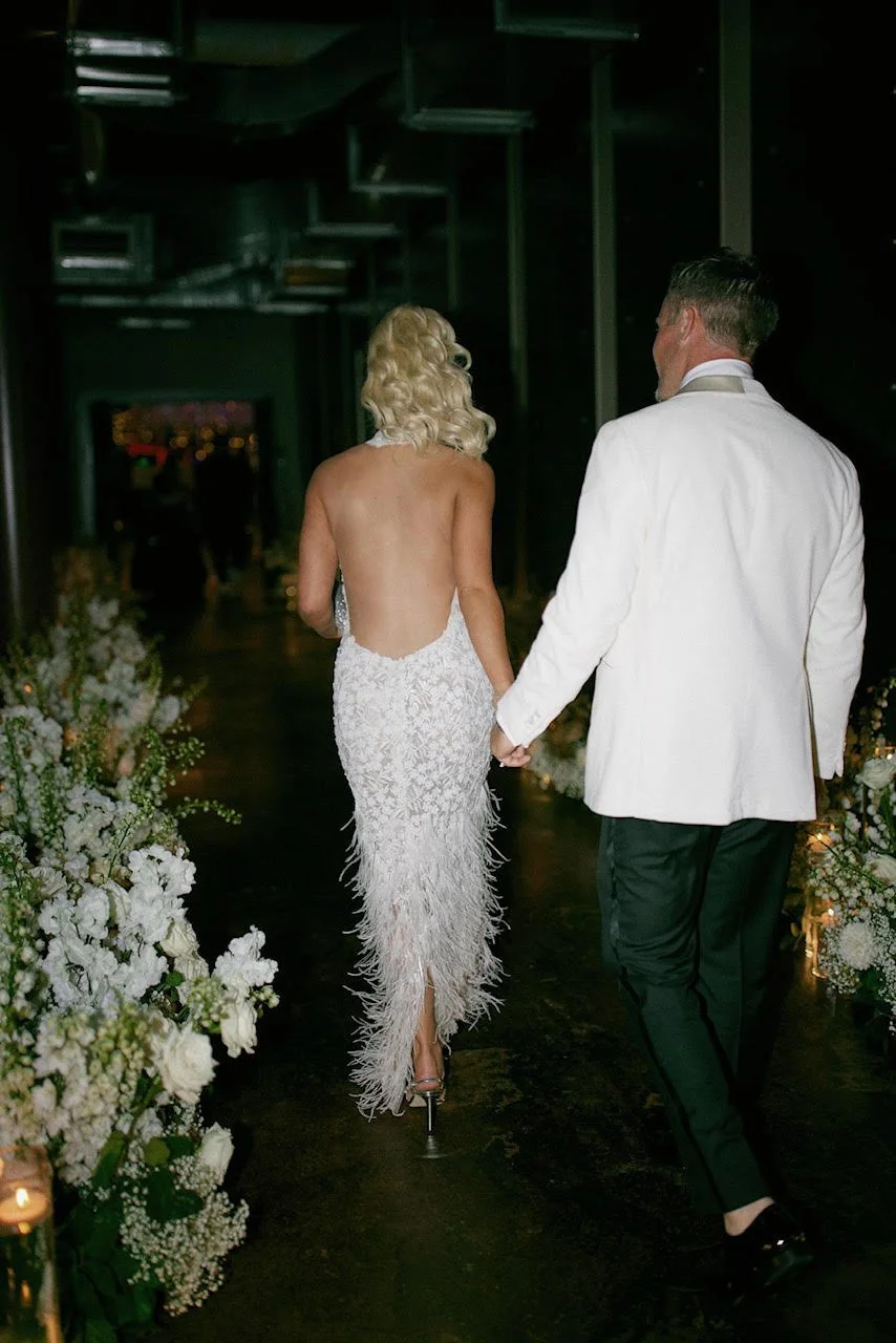 Real Chic Bride Zoe at her wedding in Tampa wearing a chic and glittery Berta dress. Hear more about her love story, how they incorporated their dog into their wedding, and how she knew that this Berta dress was “the one” for her.