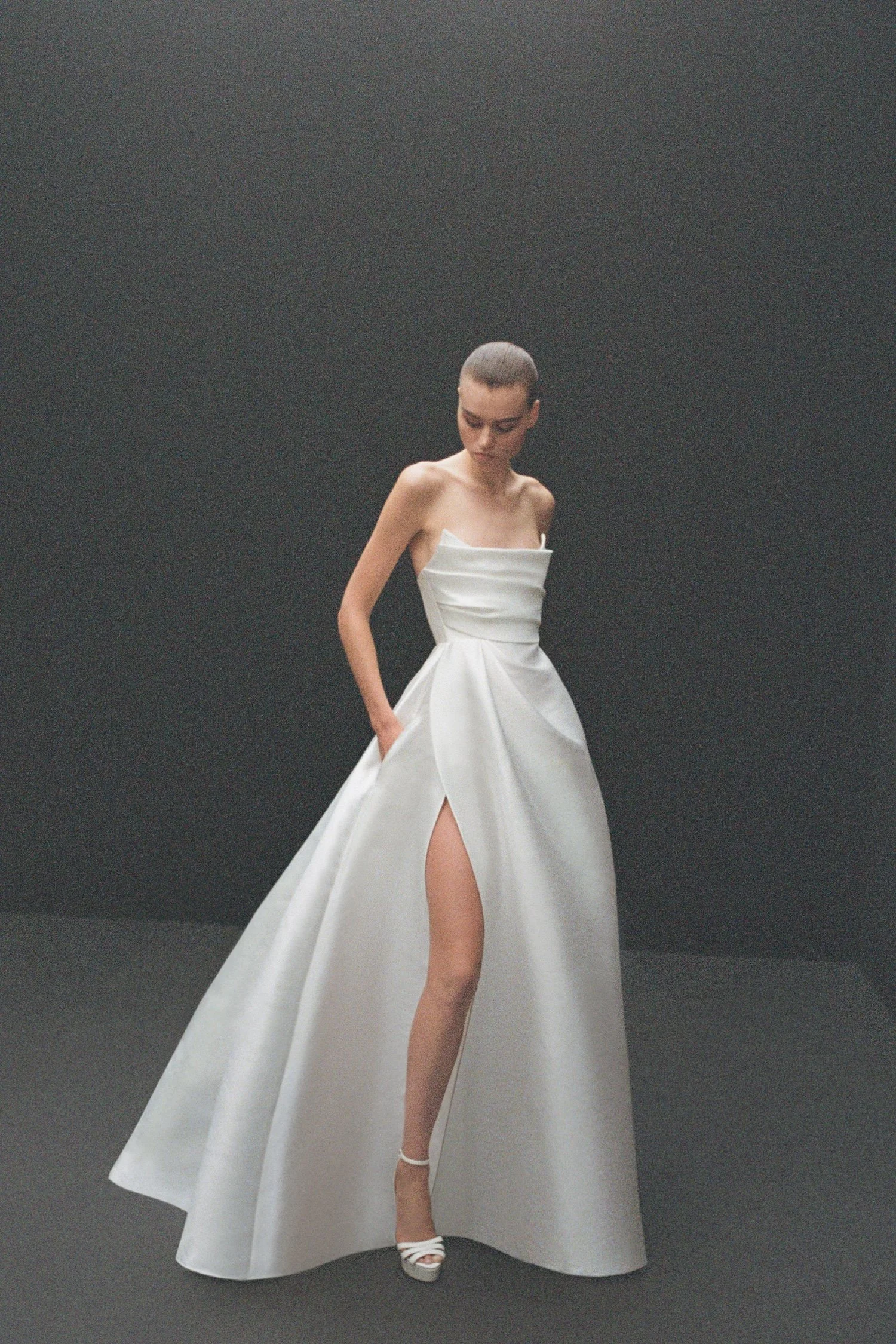Below, you’ll find an edit of wedding dresses from our designers that meet the criteria for “sparkle free dresses that still WOW.” Explore gowns from Nicole + Felicia, Alex Perry, Chosen by Kyha, Ines Di Santo, Katherine Tash and more.