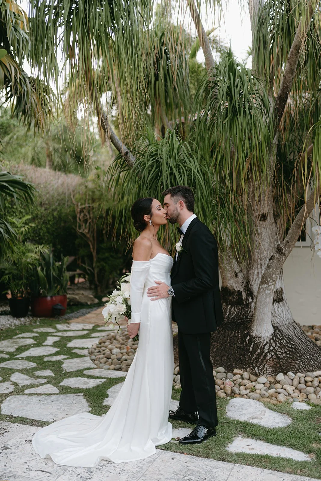 Shortly after, as we headed to the church for the ceremony, we stopped to take photos in the beautiful, lush Miami Beach neighborhood surrounding it. As we were shooting in front of one of the homes, the owner happened to pull into her driveway. She smiled, rolled down her window, and said, “This is a sign—my husband and I have been married for over 30 years, and today is our anniversary.” She even invited us into her stunning home and allowed our photographer to take a few photos inside. It was such a serendipitous and heartwarming moment that made the day feel even more meaningful.